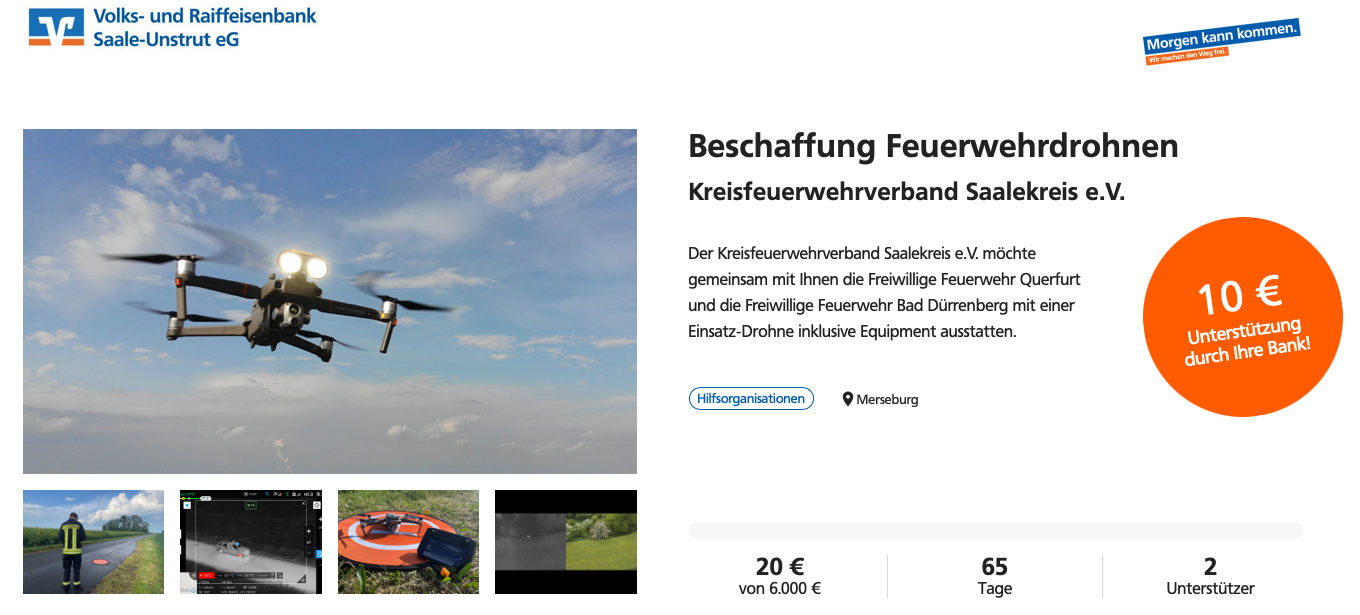 Um die Sicherheit in der Bevölkerung weiter zu verbessern und die Technik dem neuesten Stand anzupassen, möchten wir mit Ihrer Unterstützung je eine Einsatz-Drohne für die Feuerwehren Querfurt und eine weitere Feuerwehr im Saalekreis anschaffen.