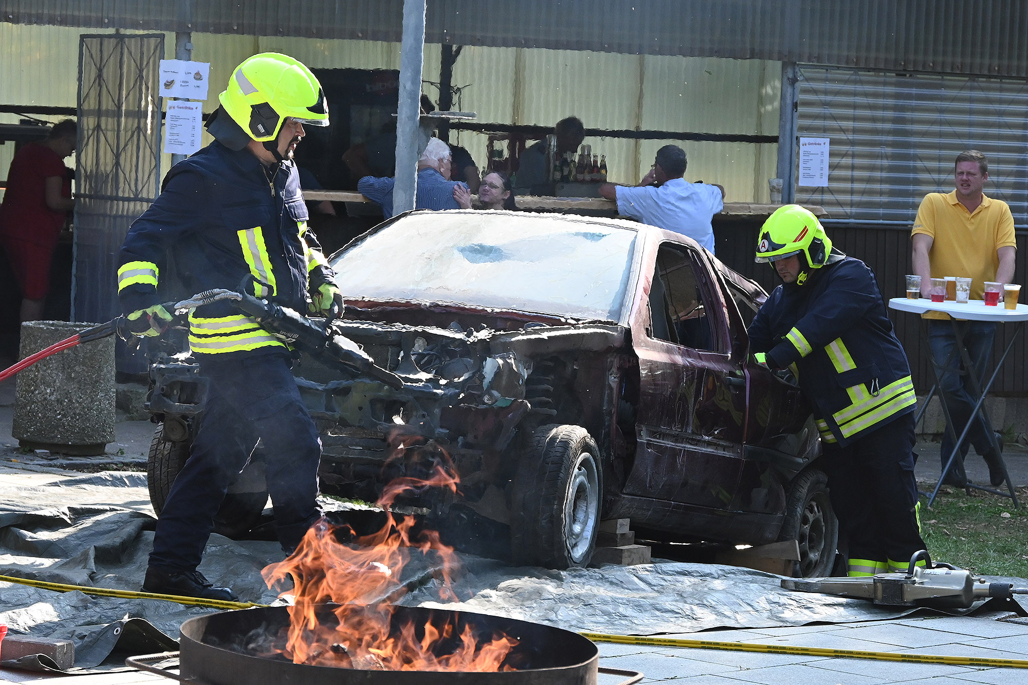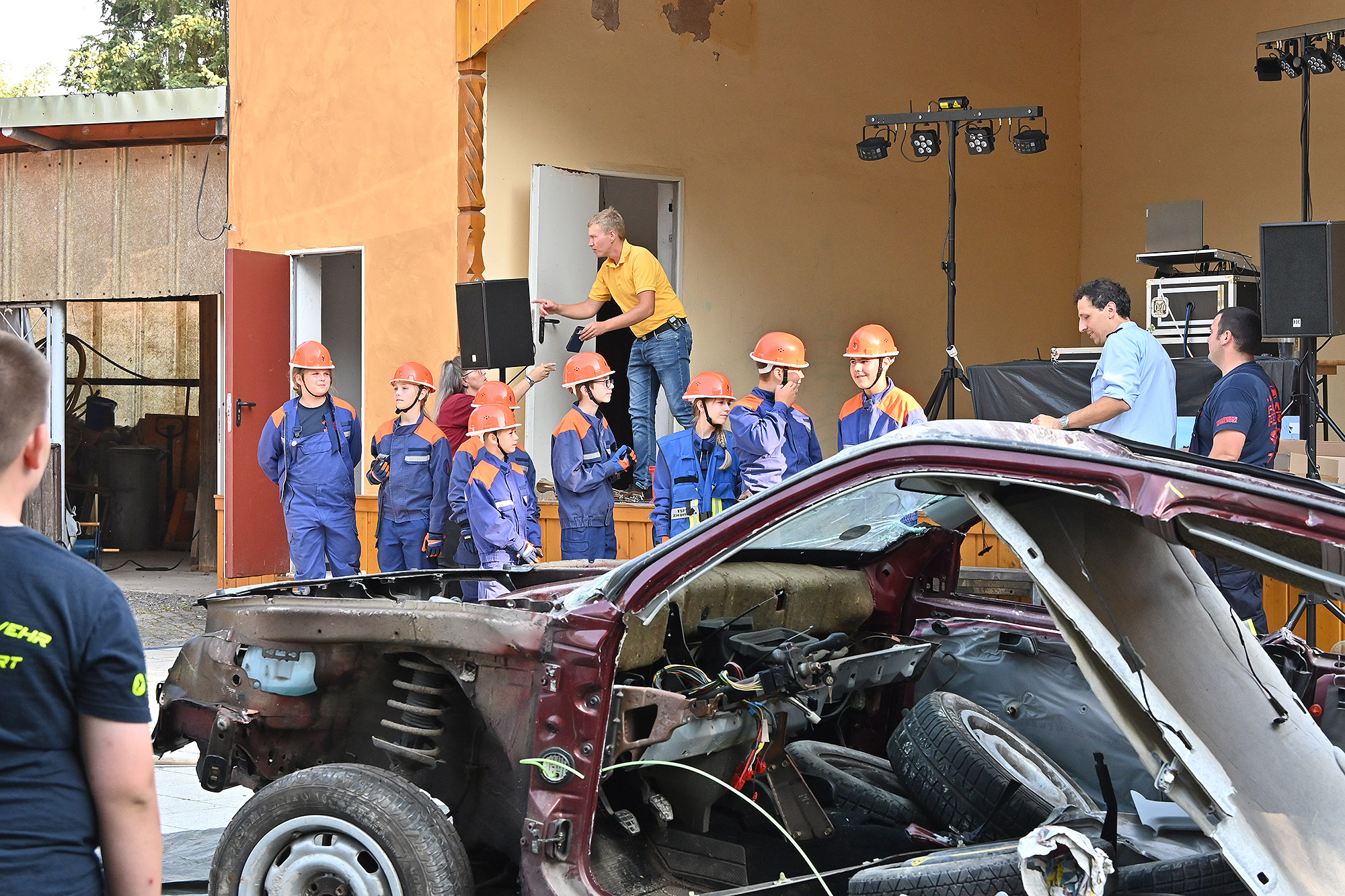 Dann hatten die Besucher eine Möglichkeit, Einblick in die Feuerwehrtaktik zu gewinnen: Bei einer Übung mit der Technischen Hilfeleistung zur Rettung einer eingeklemmten Person aus einem verunfallten PKW konnten sich die Gäste von der Leistungsfähigkeit der Feuerwehr überzeugen. Kamerad Fiedler erklärte die Vorgehensweise, sodass auch fachfremde Gäste das Einsatzgeschehen durchschauen konnten. Auch die Jugendfeuerwehr zeigte ihr Können bei einem simulierten Löscheinsatz. So kam kein Zweifel auf, dass sie schon bald die Reihen der Einsatzkräfte verstärken werden.
