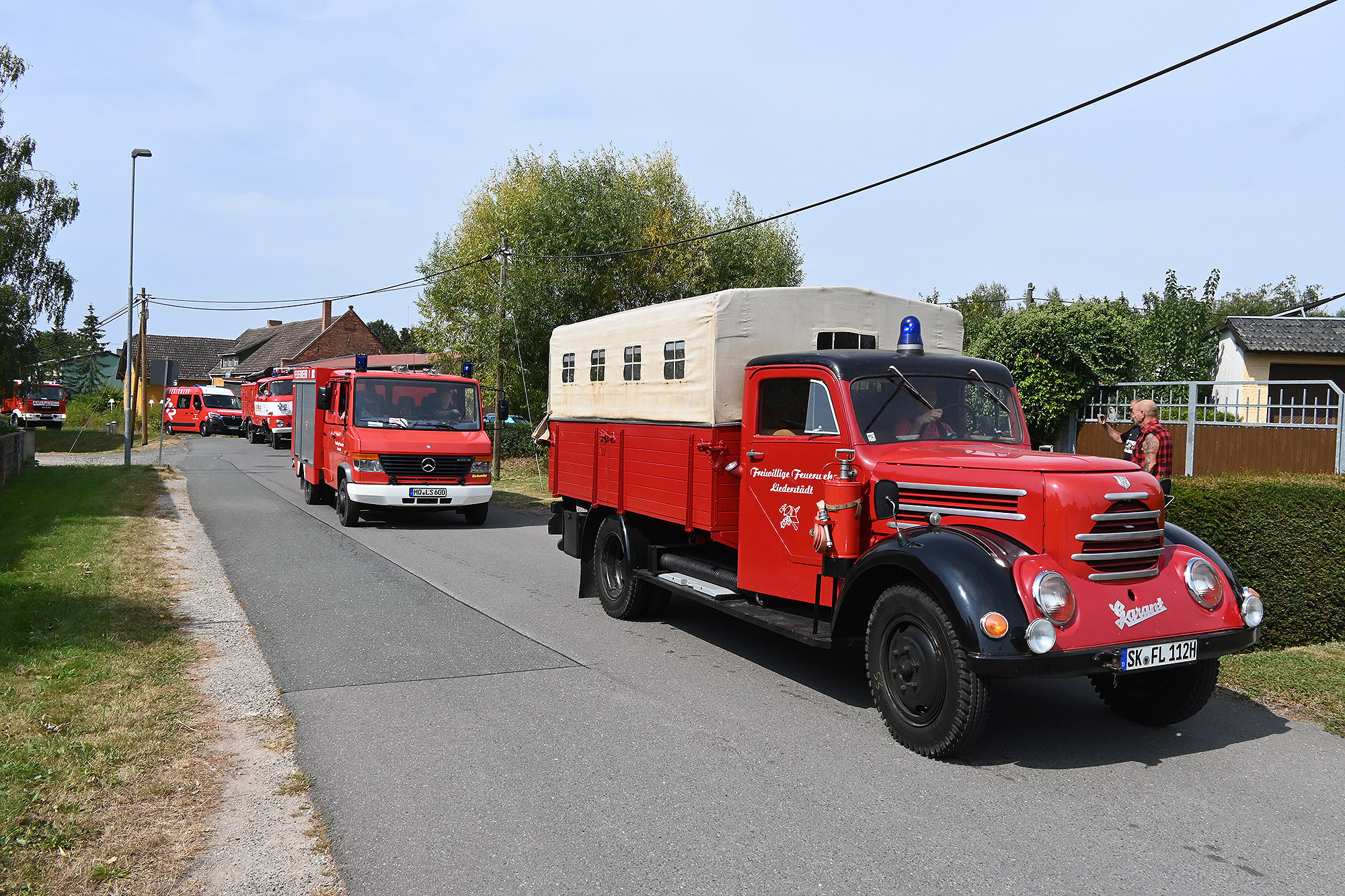 Bei einem Festumzug, dem sich neben der Ortsfeuerwehr auch die Gäste aus Querfurt, Gatterstädt, Leimbach, Spielberg, Niederschmon, Lodersleben und Alberstedt - sowie aus dem benachbarten Kyffhäuserkreis Roßleben und Wiehe anschlossen - konnten sich die Anwohner an modernen und historischen Fahrzeugen erfreuen. Angeführt wurde der Umzug von der Schalmeienkapelle Landgrafrode, die vor kurzem ihr 50-jähriges Bestehen gefeiert hatte.
