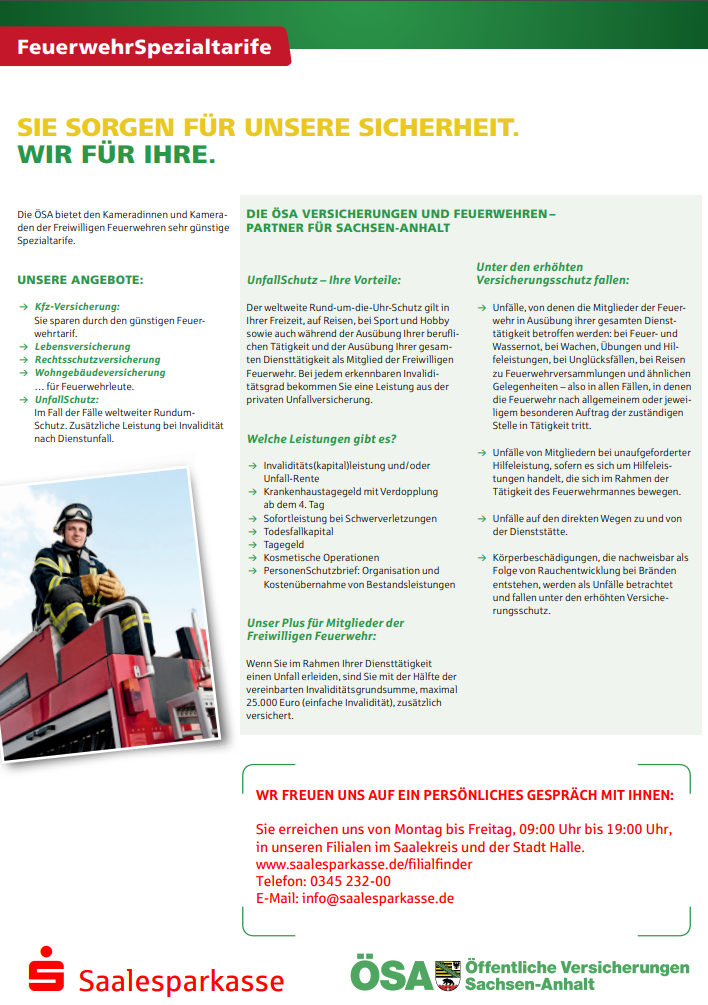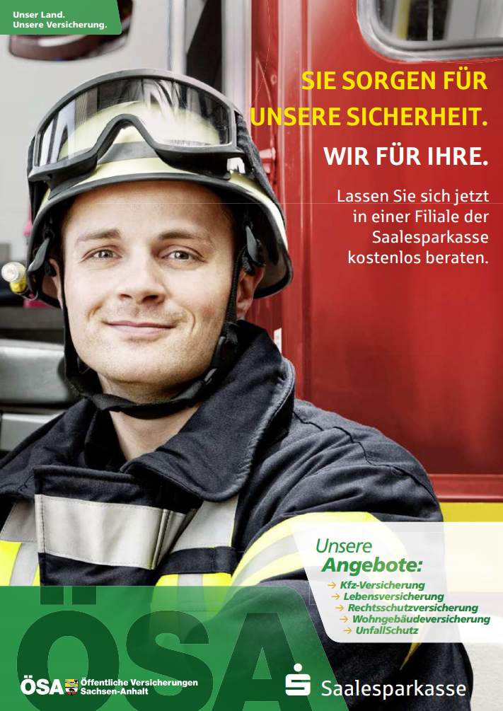 Als Mitglied der Freiwilligen Feuerwehr profitieren Sie bei der Saalesparkasse von der Erfahrung und den besonderen Konditionen der ÖSA Versicherungen. Mit Herz und Fachwissen setzen Sie sich für die Allgemeinheit ein und verdienen dafür einen speziellen Versicherungsschutz. In Notsituationen helfen Sie anderen und falls Ihnen aber selbst einmal etwas passiert, sind wir für Sie da. Von Auto bis Wohnung: Finden Sie die passende Versicherung für Ihre Bedürfnisse.