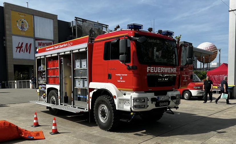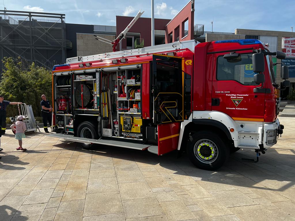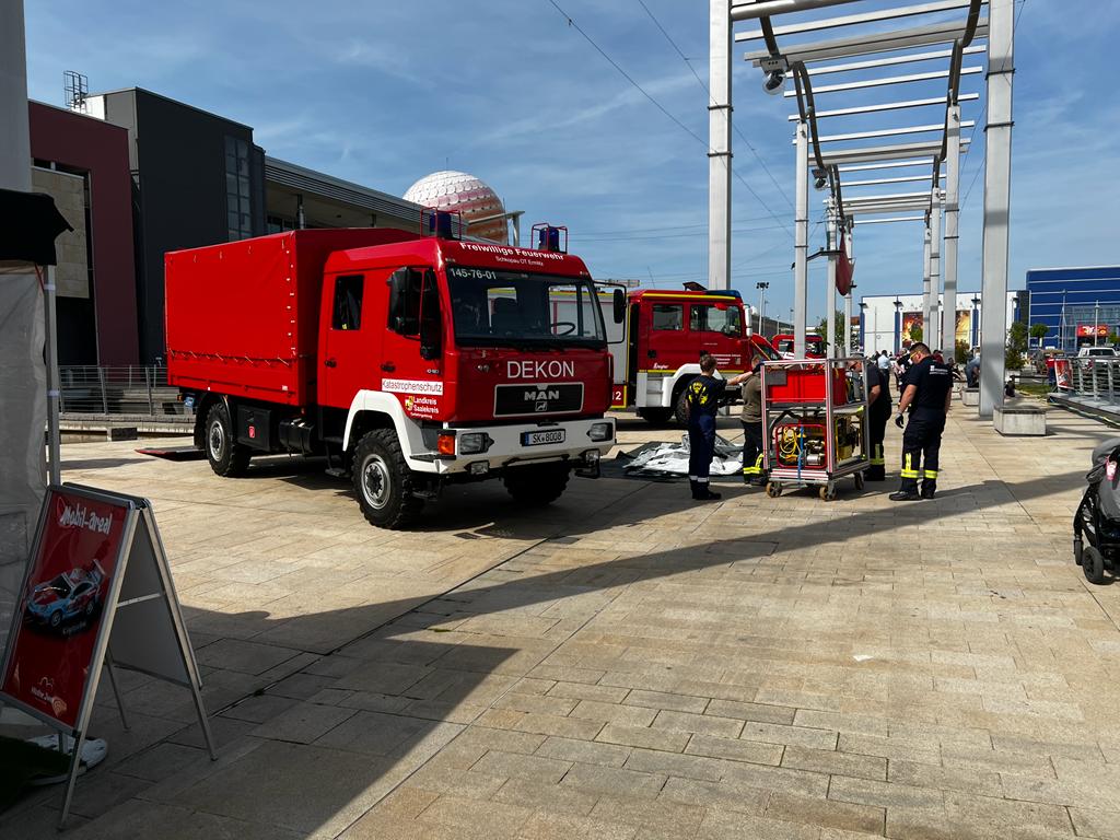 ...beteiligten sich an der Präsentation der täglichen Arbeit der verschiedenen Helfer*innen. Unter der Leitung des Vorsitzenden des Kreisfeuerwehrverband Saalekreis e.V., Dr. Björn Weber konnten zahlreiche Feuerwehren den Besucher*innen des Shopping-Centers aus dem Saalekreis sowohl ihre Technik, als auch ihre Tätigkeiten näher bringen. Neben dem Aufbau einer Ölsperre wurde unter anderem auch die Verwendung einer Sichtschutzwand, wie sie häufig bei Verkehrsunfällen auf Autobahnen eingesetzt wird, präsentiert. Die Feuerwehr Zöschen-Zweimen stellte indes ihr erst eine Woche zuvor eingeweihtes HLF 20 vor. Dieses Fahrzeug entspricht den neuesten Anforderungen und verfügt über eine umfangreiche feuerwehrtechnische Ausstattung zur Bekämpfung von Bränden sowie zur Leistung von technischer Hilfe. Außerdem stellte sich der Gefahrgutzug Saalekreis mit mehreren Fahrzeugen auf der Esplanade des Shopping-Centers vor.